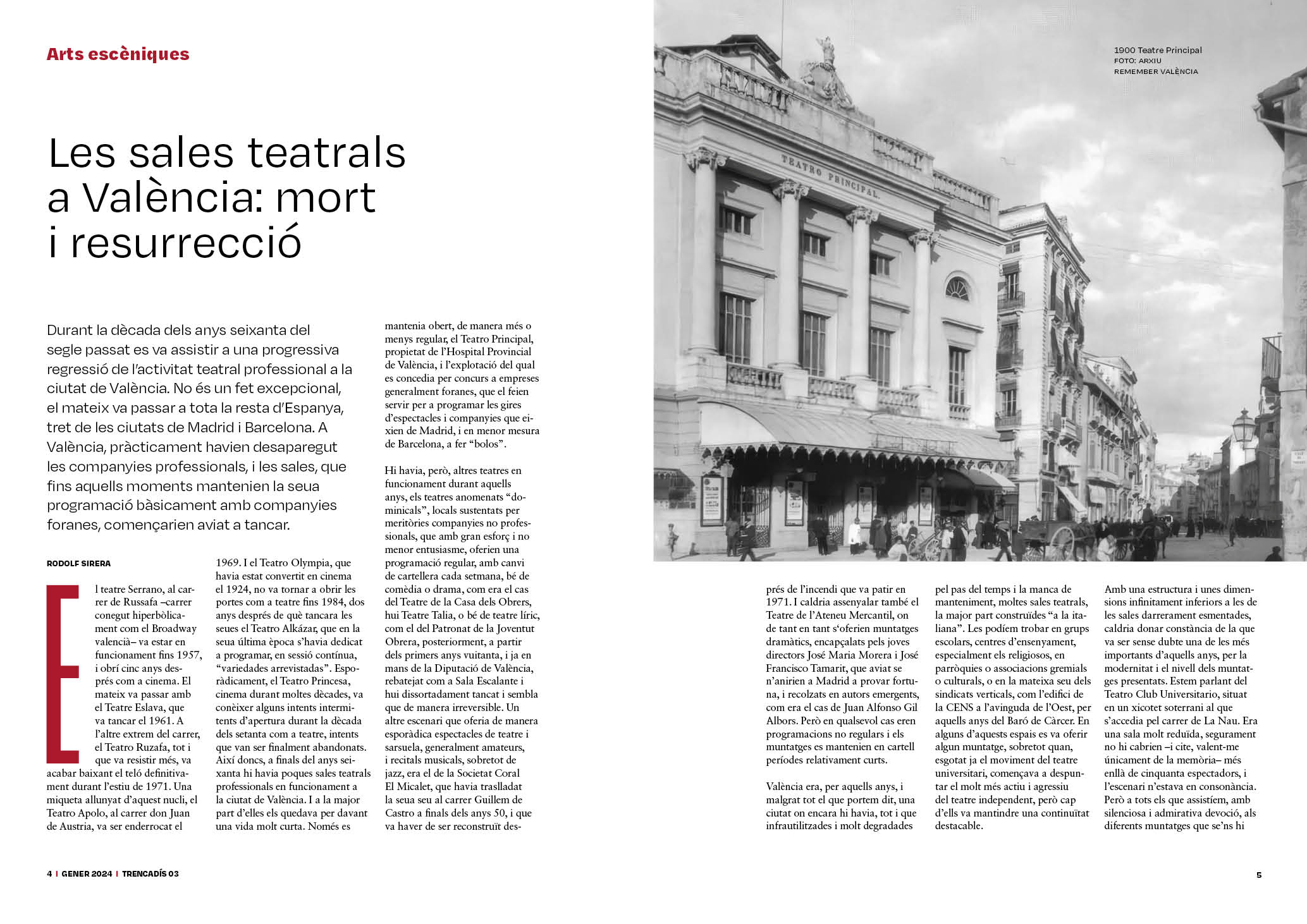 D’aquells anys ençà tot ha canviat molt a la nostra ciutat per al teatre. El número d’espais de representació ha crescut considerablement. Hi ha sales dependents de les institucions, teatres privats de tots els formats i tamanys. Fins a tal punt que m’atreviria a dir que hui València és una de les ciutats de l’estat espanyol amb més espais dedicats a les representacions teatrals i de dansa. Els anys seixanta del segle passat el panorama era prou negre, com hem vist. Ara, cinquanta anys després, podem dir, sense por i amb orgull, que les arts escèniques valencianes estan més vives que mai. n